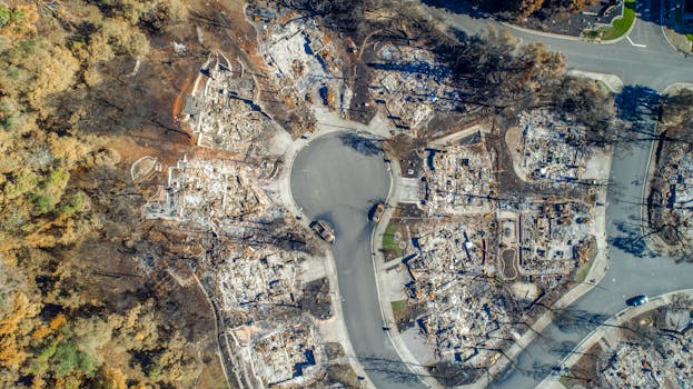 Aerial view of Santa Rosa neighborhood devastated by Tubbs Fire. Burned homes visible.