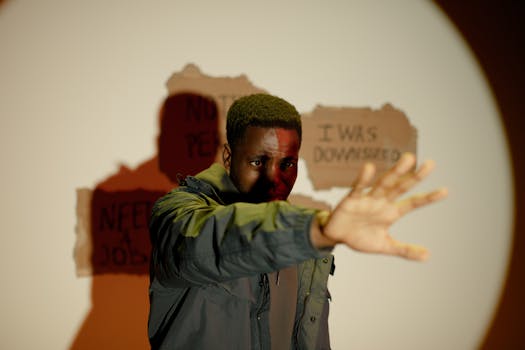 A man stands with an outstretched hand, conveying crisis and unemployment indoors.